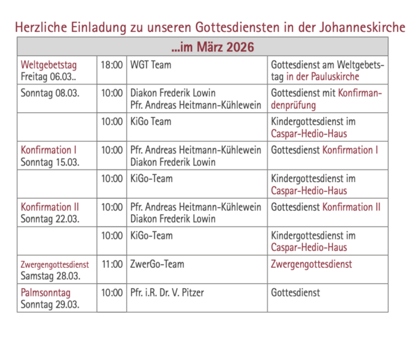 Gottesdienstübersicht Herzliche Einladung zum Gottesdienst. Gemeinschaft erleben, gemeinsam Singen, Gott loben, Glauben teilen und mit einem hoffnungsvollen Gefühl den Sonntag beginnen. Wir freuen uns auf Sie! Gottesdienste im März - Mai 2026
