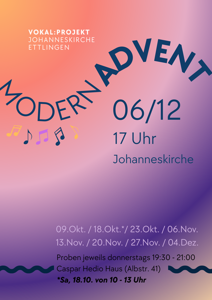 Übers Jahr verteilt gibt es verschiedene vokal:projekte mit moderner mehrstimmiger Chormusik (Gospel/Worship/Neues Geistliches Lied). Mitsingen kann jede/r, der/die gerne singt! In 5-6 Proben erarbeiten wir (meistens 30 – 50 Sänger:innen) ein Programm für einen besonderen Gottesdienst oder ein kleines Konzert mit Band. Mit viel Begeisterung!